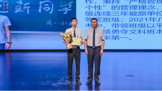两位年级主任,十二位班主任,校长十四次的握手,二十八次的鞠躬,这些数字里面饱含的是一位从深圳实验学校起航,在鹏城深耕教育20余载的一位教育老兵特有的情怀!随着每一次的握手,每一次的鞠躬,每个班级的学生也整齐划一地喊出了响亮的口号,来祝福自己的班主任,响声冲云,掌声雷动,把气氛推向了高潮!